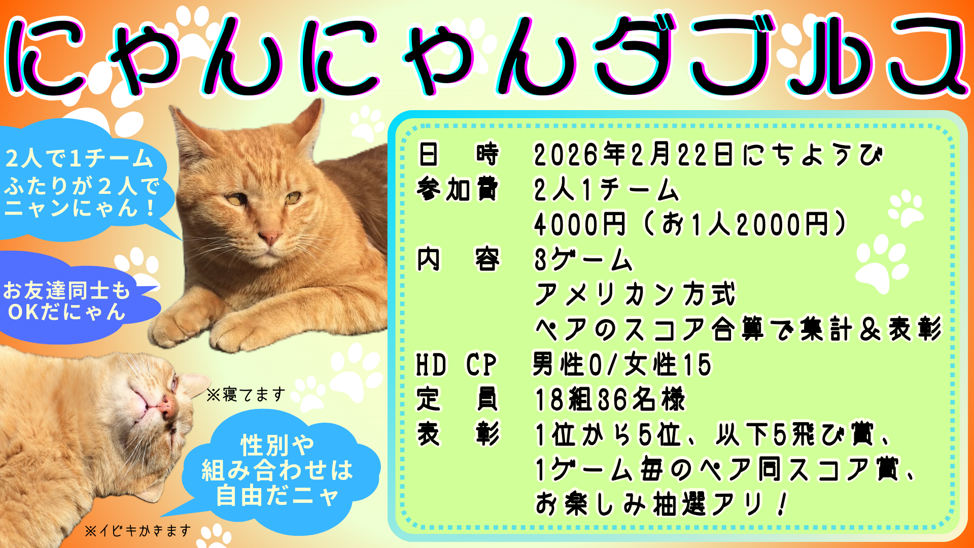 ネコ好きさんあつまれ😆💖条件は・・・👫2人参加👥であること💪✨同性同士のお友達やご夫婦、カップル、親子などなどご参加受付中🎳📝