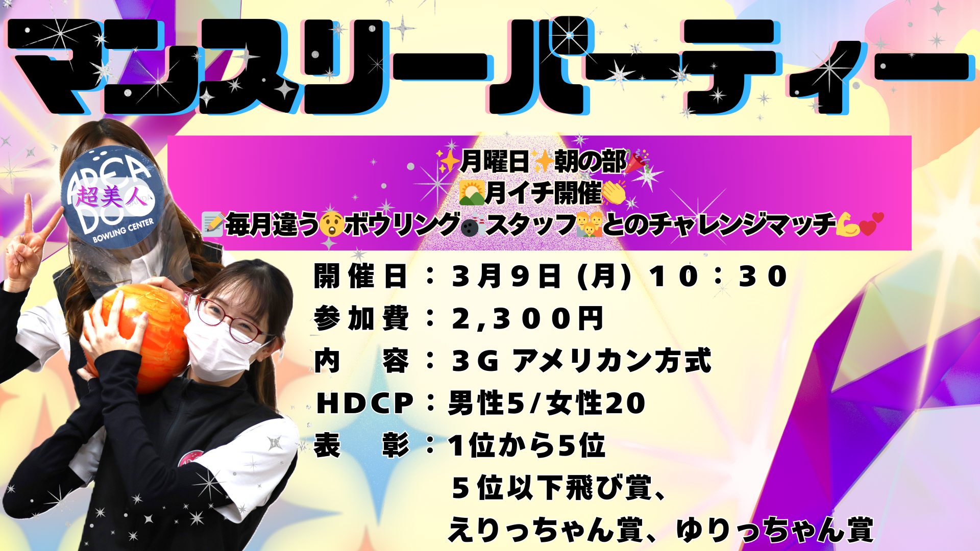 2026年3月マンスリー🎳は✨女子2人💅✨💚初心者🔰女子です👀💙👏一緒に🤗楽しい時間⏰を作りませんか❓参加ご希望の方はフロント💌または📞お電話📞にてお待ちしております😆📲