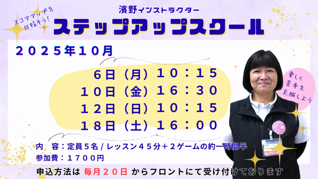 上記期間中の砂子プロ来場時間内でご予約可能、1回40分/3,400円(税込)です。マンツーマンレッスンのため、周りを気にせずじっくりプロの指導を受けられます!上記時間帯でもプロのスケジュールやレーン状況により、ご予約できない場合もございますので詳しくはフロントまでお問い合わせください。